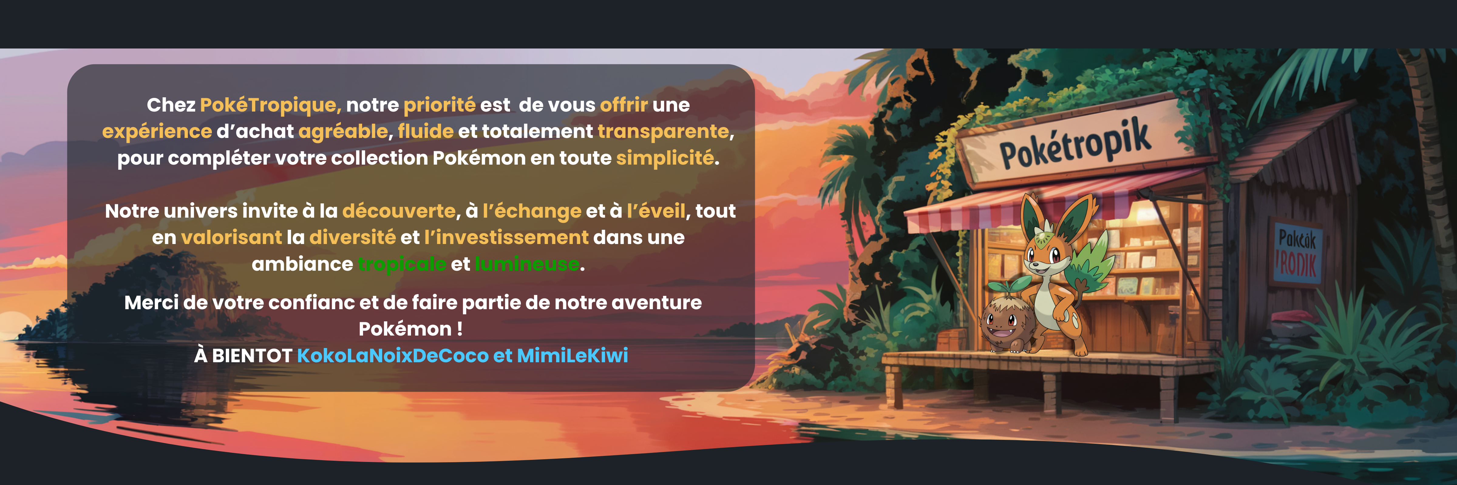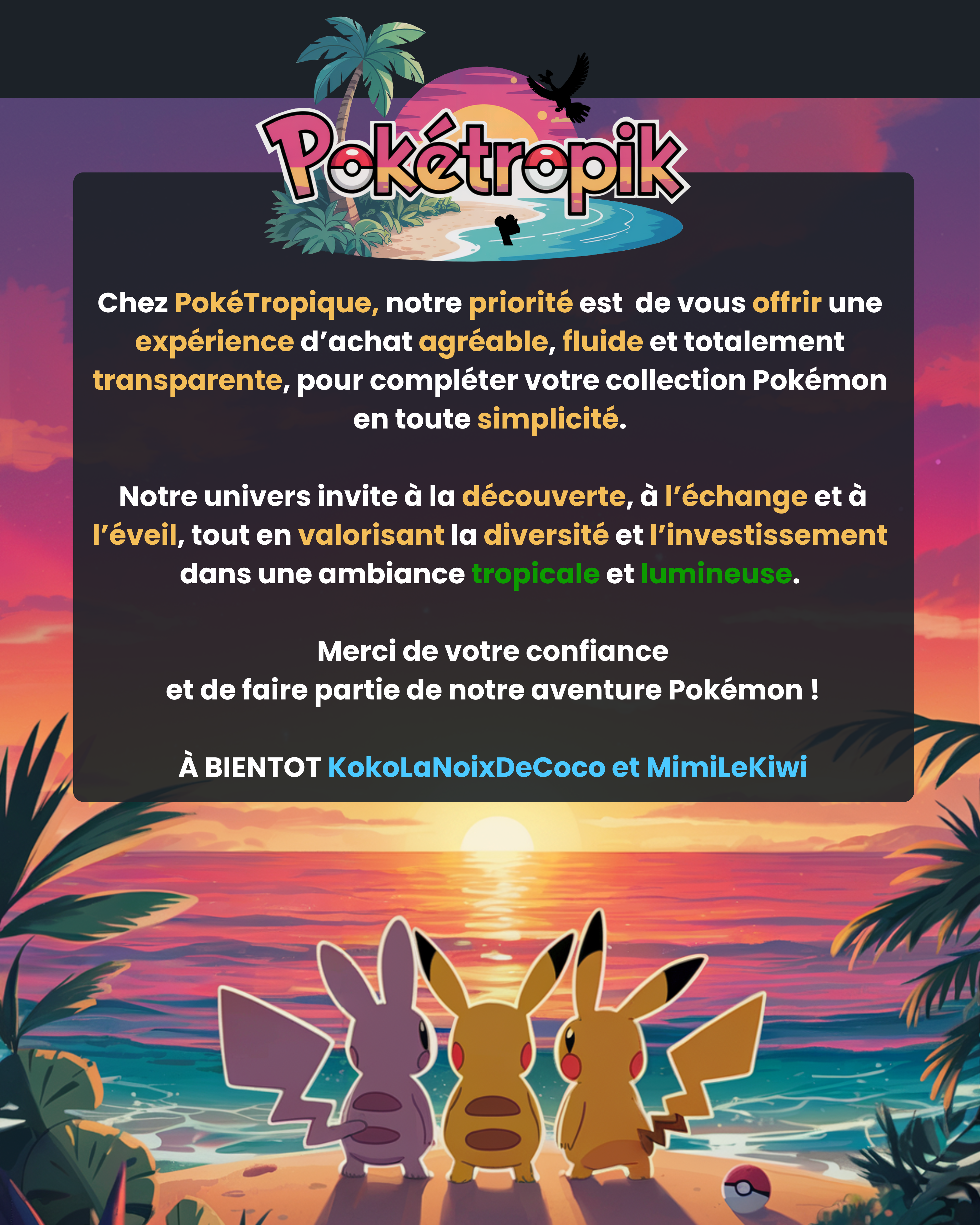 Salut bienvenue chez les collectionneurs tropicaux ! Découvrez un espace dédié aux passionnés de cartes Pokémon, où professionnalisme, soleil et passion se rencontrent. Nous vous proposons une large sélection de cartes, accessoires, et produits officiels, incluant les toutes dernières nouveautés du moment.