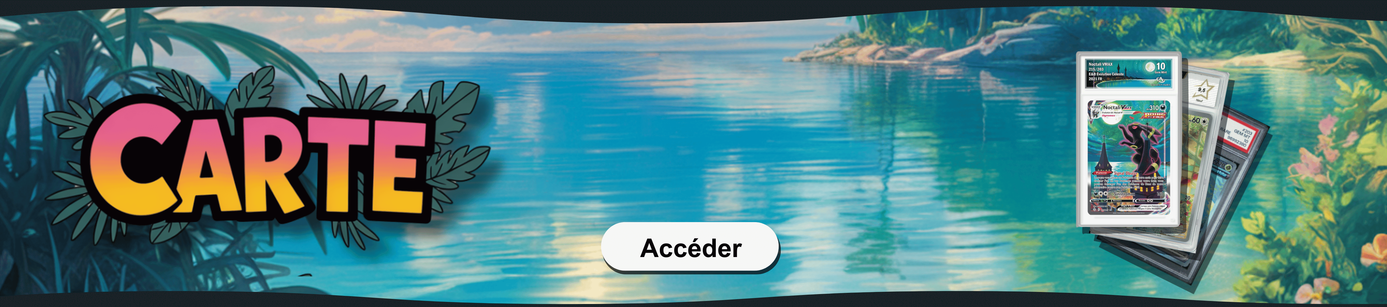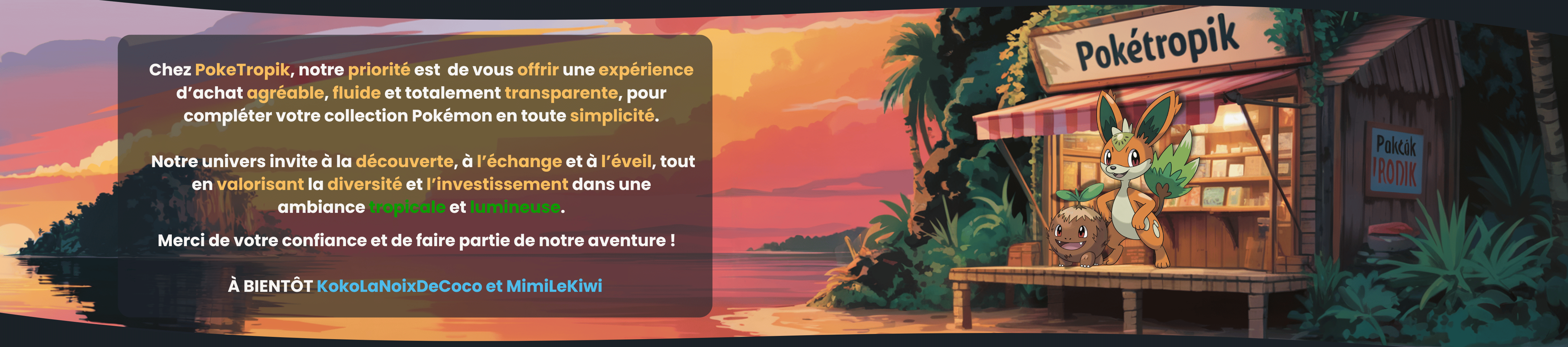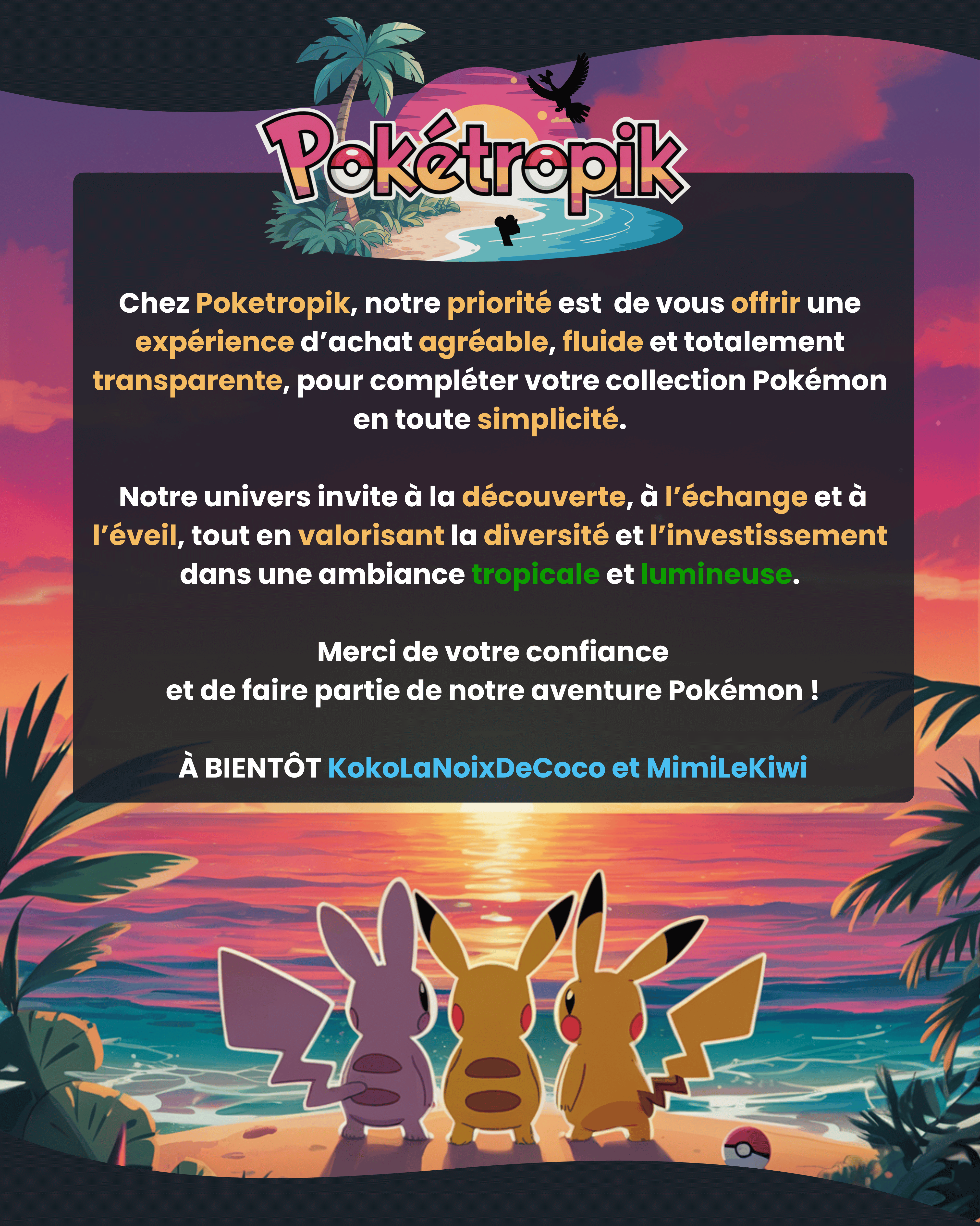 Bienvenue les collectionneurs tropicaux ! Découvrez un espace dédié aux passionnés de cartes Pokémon, où professionnalisme, soleil et passion se rencontrent. Nous vous proposons une large sélection de cartes, accessoires, et produits officiels, incluant les toutes dernières nouveautés du moment.